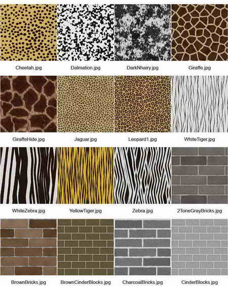 16" x 16"@ 300 dpi無縫材質圖,內容有(木材.獸皮.纖維板.磚.石板.鋼板.金屬浮雕及